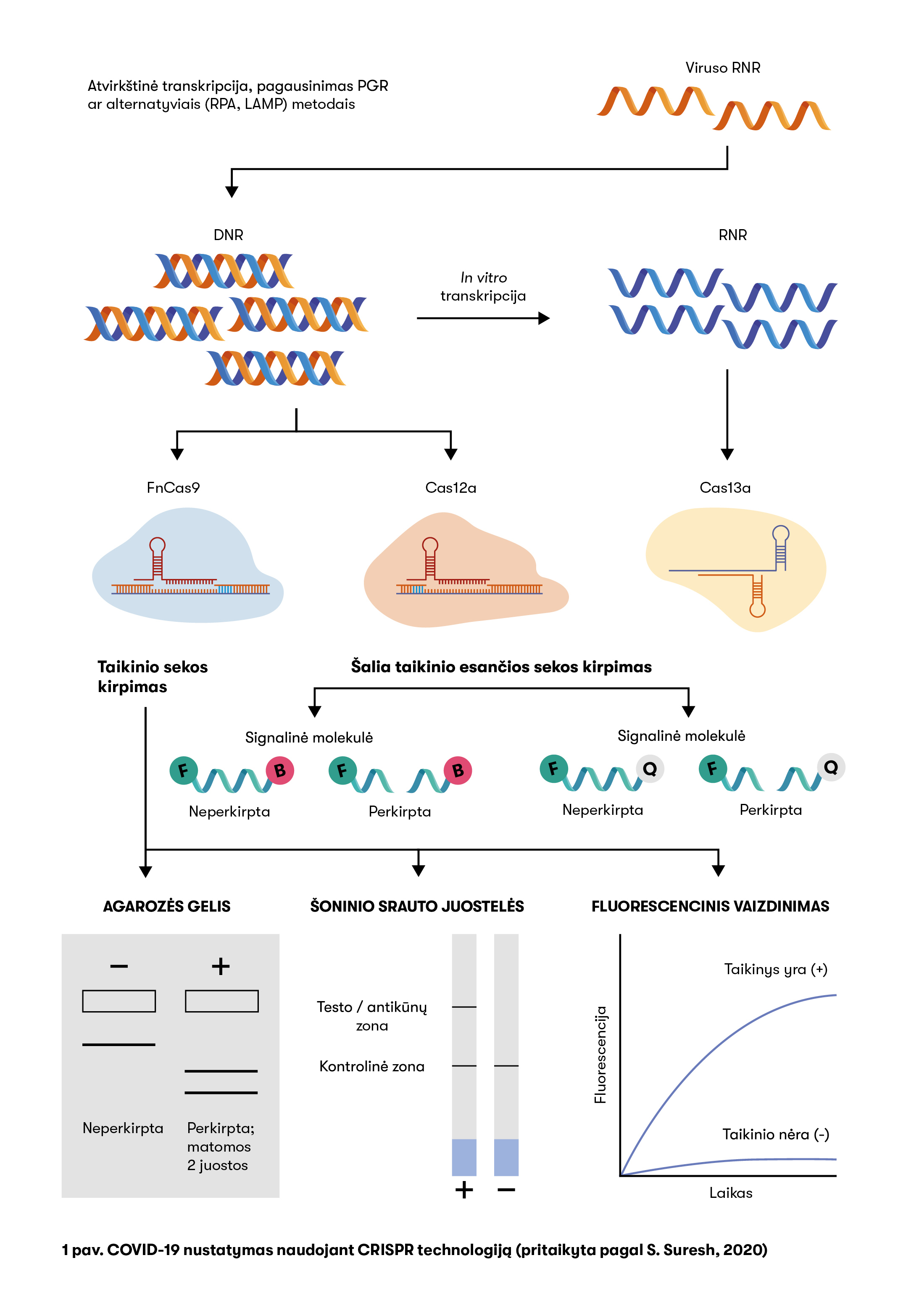 CRISRR-Cas sistema veikia endonukleazės atrankumo principu – fermento aktyvumas priklauso nuo komplekse esančios sekos, kuri yra komplementari ieškomam fragmentui. Esant atitikimui, sukeliamas specifinis reporterinės sekos kirpimas, taip atpalaiduojant molekulę, lemiančią spalvinę ar kokią kitokią teigiamą rezultatą rodančią reakciją. Nieko nuostabaus, kad ši technologija imta taikyti ir COVID-19 nustatyti (1 pav.).