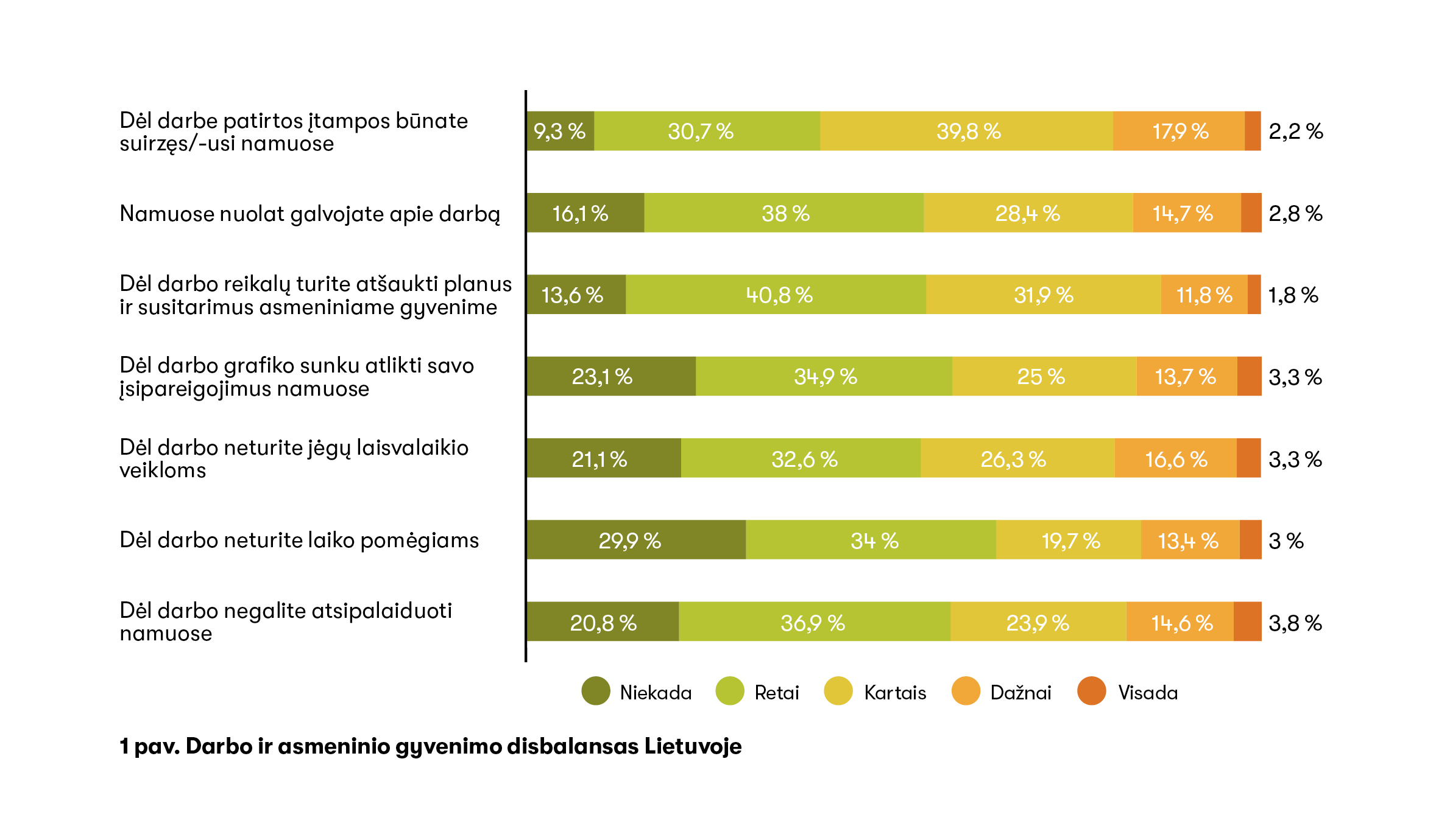 Rezultatai parodė, kad tik mažiau nei 4 proc. apklaustų darbuotojų beveik visada ar visada patyrė darbo ir gyvenimo disbalansą, o du trečdaliai nurodė retai ar tik kartais dėl darbo reikalų negalintys atsipalaiduoti namuose, neturintys laiko ar energijos laisvalaikiui ar turintys atšaukti asmeninius planus. Tai atitinka jau minėto „Eurofound“ agentūros atlikto Europos darbo sąlygų tyrimo rezultatus, liudijančius, kad Lietuvoje darbo ir gyvenimo disbalansą nuolatos patiria 3–4 proc. Lietuvos darbuotojų ir tai yra mažiausias vidurkis iš visų apklausoje dalyvavusių šalių (1 pav.).