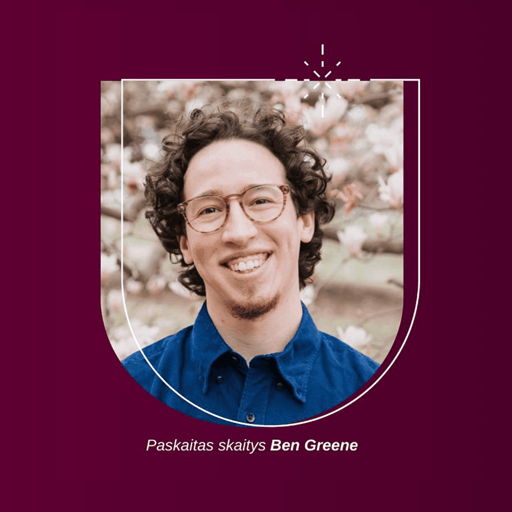 Paskaitas skaitys Ben Greene – translyčių asmenų teisių gynėjas ir švietėjas, kuris tarptautiniu mastu kalba apie translyčių asmenų integracijos temas. Po to, kai būdamas 15 metų amžiaus mažame miestelyje atsiskleidė esąs translytis, Ben savo karjerą paskyrė empatijos, švietimo ir pasakojimų apie translyčių asmenų patirtis skleidimui tarptautiniu mastu. Ar tai būtų NASA, „Johnson & Johnson“, ar daugiau nei 140 PFLAG (JAV organizacija, remianti LGBTQ+ žmones ir jų šeimas) skyrių, Ben su džiaugsmu imasi lyderystės. Jis yra populiaraus substacko „Good Queer News“ autorius, taip pat knygos „My Child is Trans, Now What? A Joy Centered Approach to Support“ autorius. Jis yra aktyvus translyčių jaunuolių gynėjas, reguliariai pasisakantis už juos Misūrio valstijos kapitolijuje.