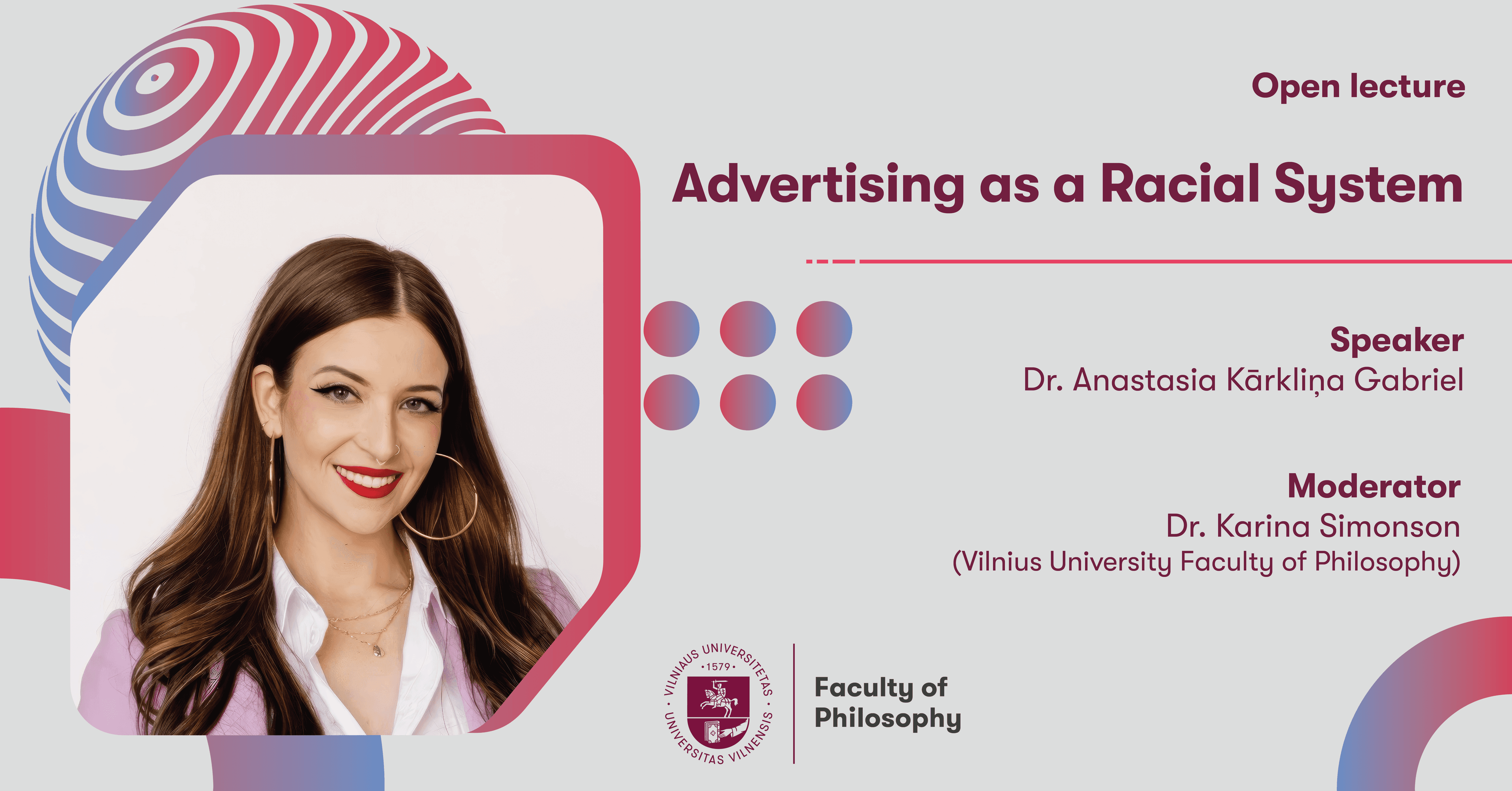 2026 m. balandžio 17 d., 15:15 val. kviečiame jus į dr. Anastasia Kārkliņa Gabriel atvirą paskaitą „Advertising as a Racial System“. Paskaita vyks nuotoliniu būdu, prie jos galite prisijungti pasinaudoję šia nuoroda - Advertising as a Racial System | Meeting-Join | Microsoft Teams