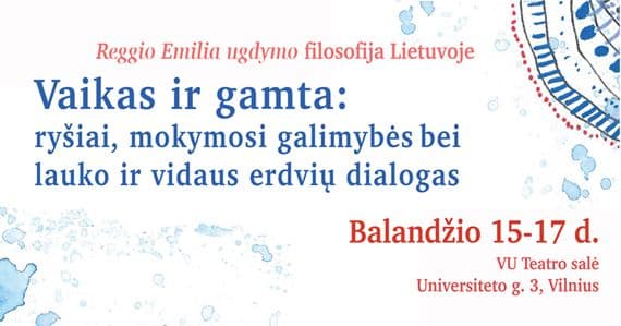2026 m. balandžio 15 d., trečiadienį, 9–18 val. VU Teatro salėje (Universiteto g. 3, Vilnius) – tarptautinė Reggio Emilia ugdymo filosofijai skirta konferencija „Vaikas ir gamta: ryšiai, mokymosi galimybės ir dialogas tarp lauko ir vidaus erdvių“ („The Child in Nature: Relationships, Learning Opportunities, and the Dialogue Between the Outdoors and the Child“).